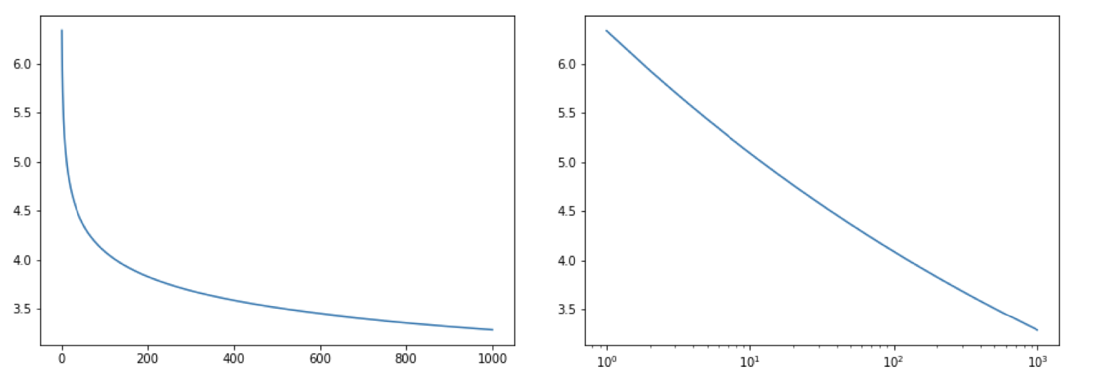 (Left) you have normal power law distribution and (Right) shows that scaling x-axis to log gives a linear graph. Which helps when working exponentially increasing/decreasing values. \(y = f(x) = 5.6 x^{-0.095} \forall x \in [0,1000) \)